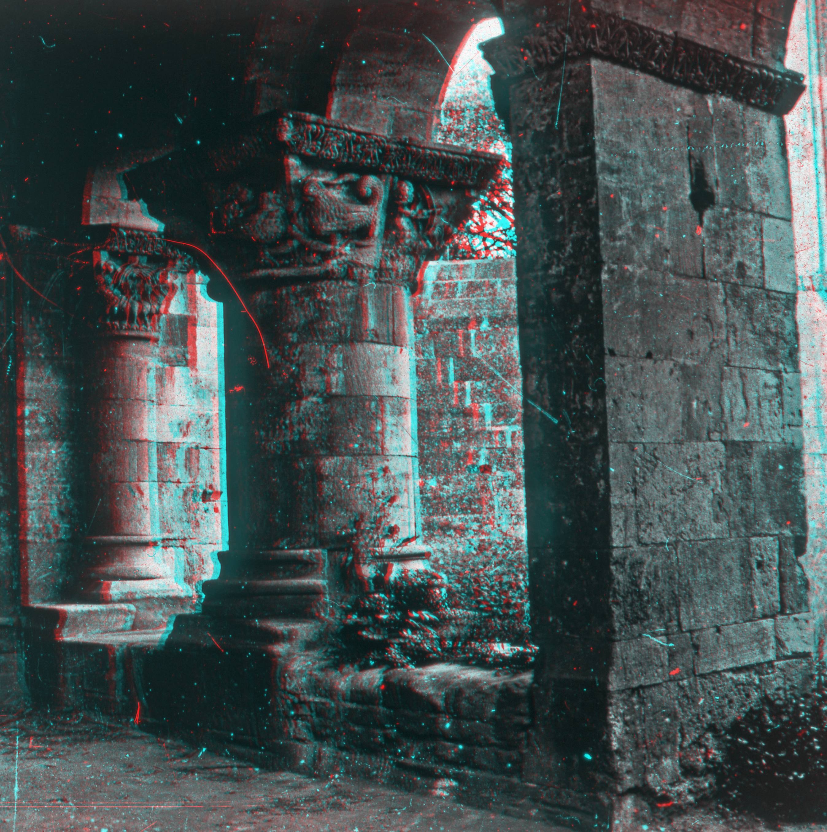 Dans l'absidiole nord que l'on aperçoit sur cette photographie sont encore conservés des chapiteaux romans. Ici on peut voir sur un des chapiteaux du pilier un combat d'aspics et de basilics.