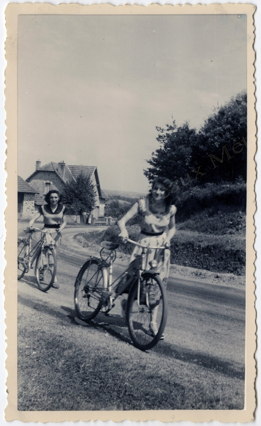 Vues de la caravanne publicitaire et de deux amies poussant leur bicyclette.