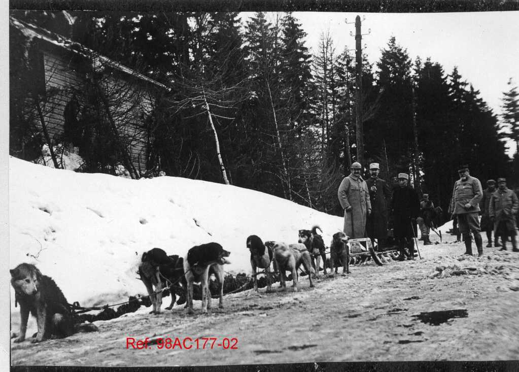 Attelage de chiens tirant un traîneau, encadré par des soldats en uniforme, sur une route enneigée