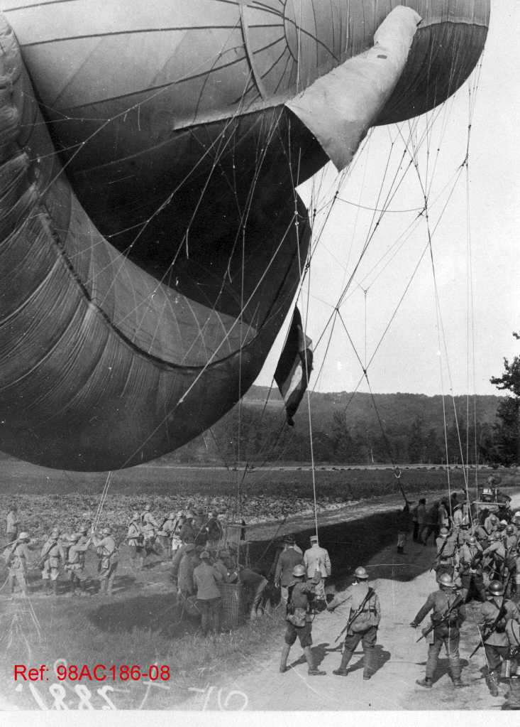 Atterrissage d'un ballon Caquot, ballon captif d'observation dit "saucisse", de la 152e division. On voit de de nombreux soldats au sol chargés de faire atterrir le ballon.