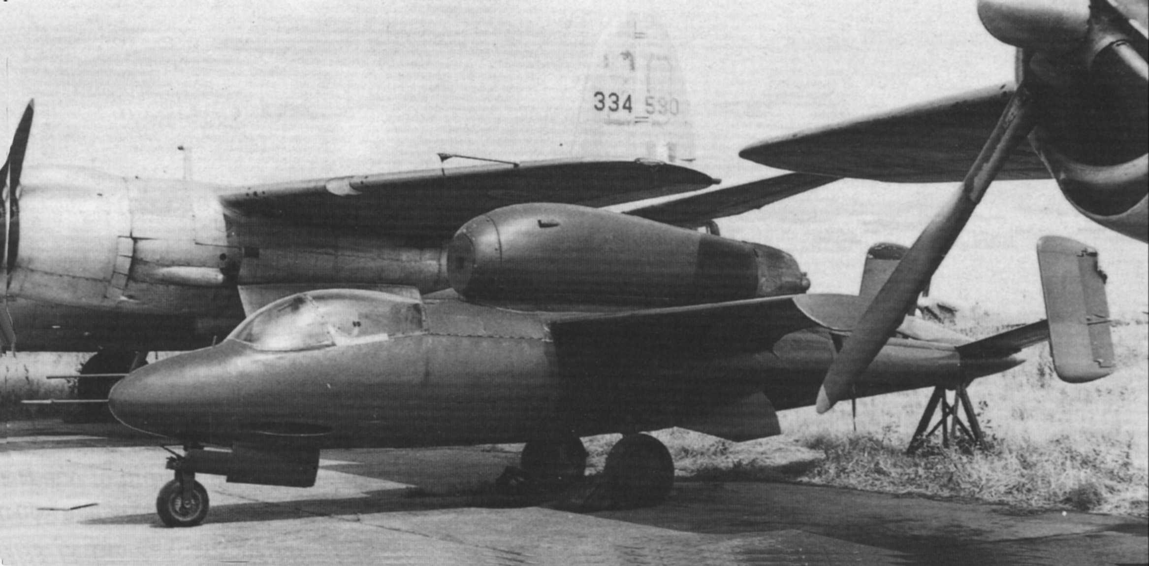 Il s'agit du SNCASO He 162 A N° 2 affecté au CEV en 1946 et livré à la base de Rochefort courant 1949. L'avion était peint en rouge bordeaux foncé et portait bien les cocardes. Il avait également, sur le nez, un second pitot au-dessus de celui d'origine. Dans la région, il fut souvent exposé dans les foires environnantes sous l'appellation "Avion SNCASO expérimental"