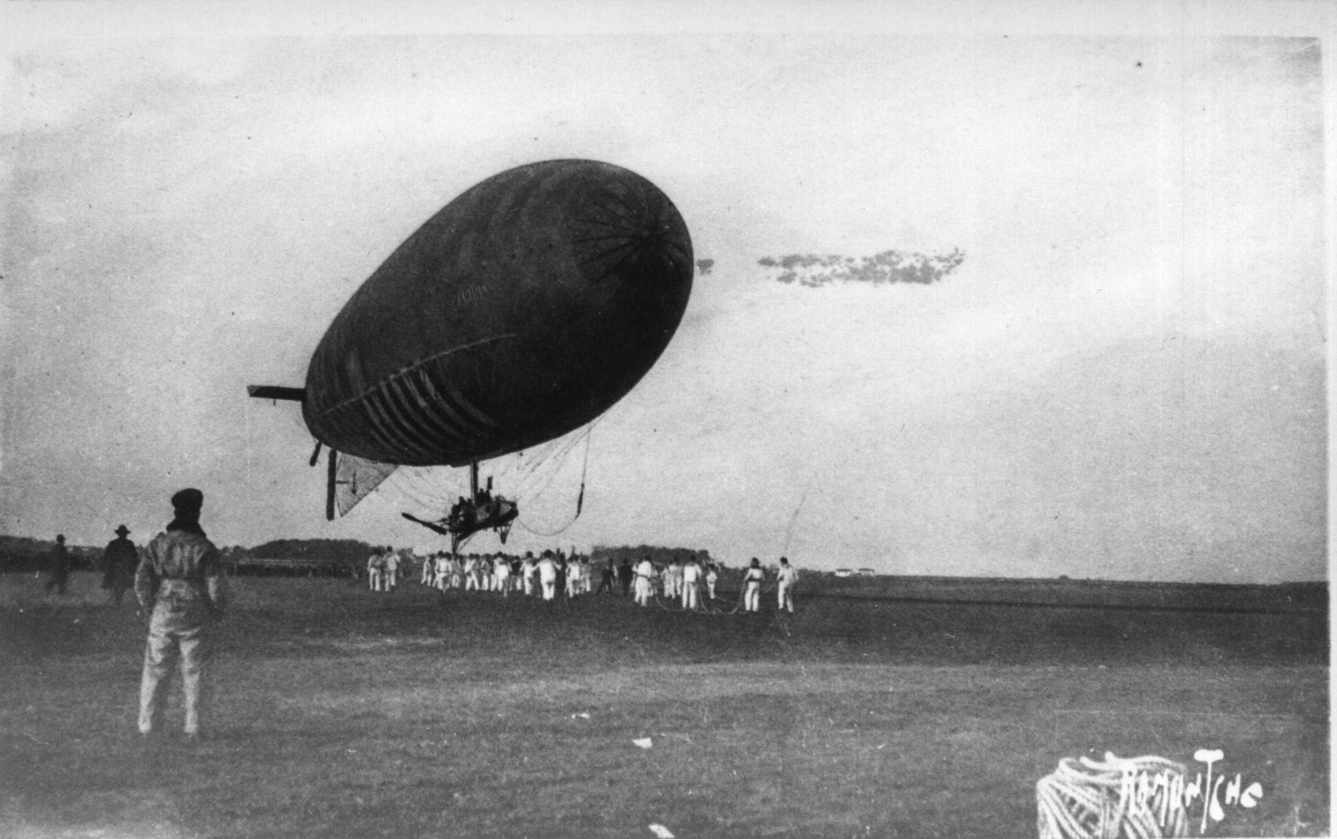 Ballon dirigeable dans les airs à Rochefort. En premier plan, un homme surveille la manoeuvre.