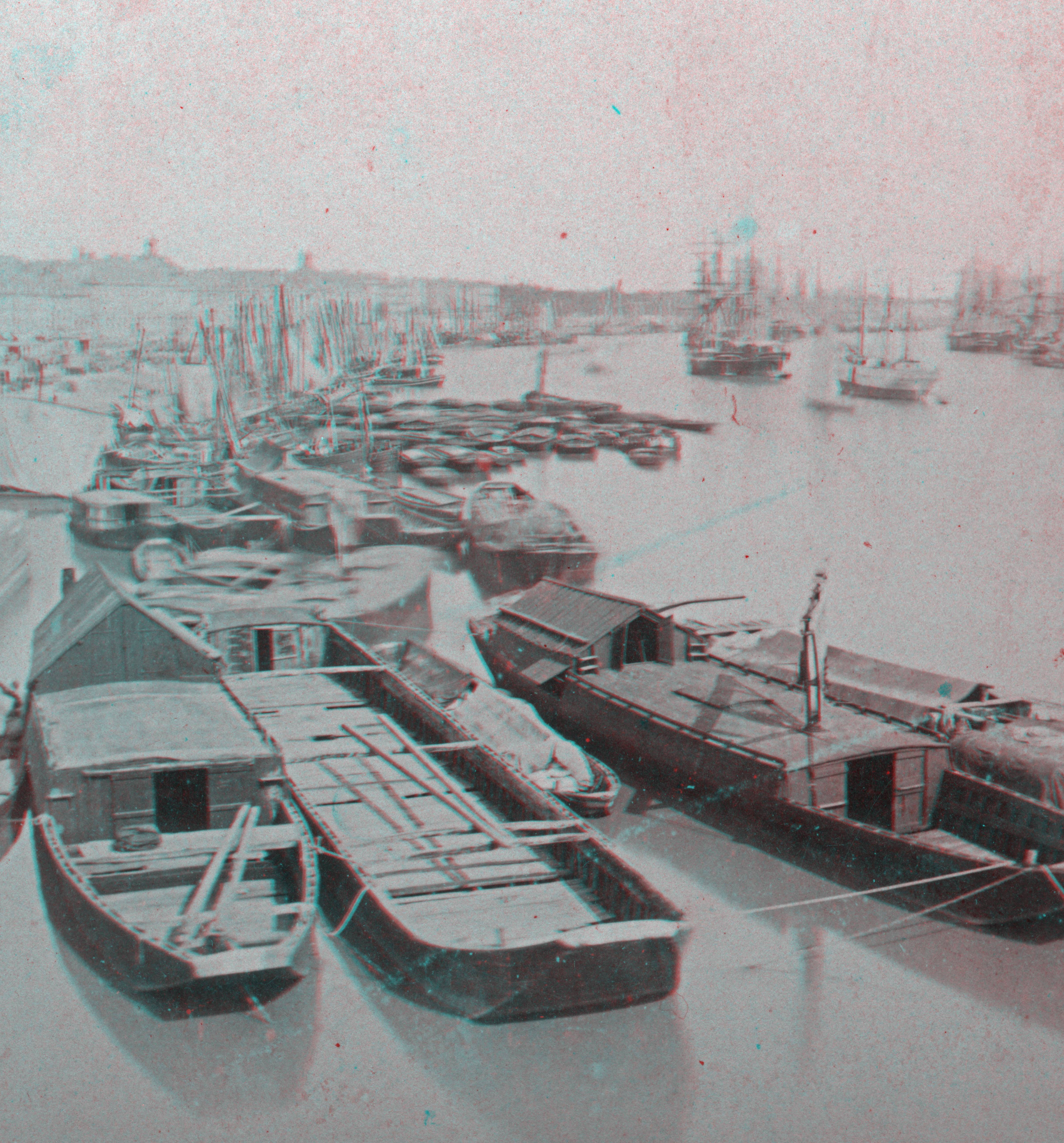 Photo peut-être prise du parapet qui descend du Pont de Pierre, sans doute du quai Richelieu (aussi appelé quai de Bourgogne) plutôt que du quai de La Douane.Au premier plan, de gauche à droite sur la photo de droite, nous avons : en premier, une petite allège chargée de sacs ou de pierres ; en troisième, quatrième et sixième position, des allèges de différentes tailles, la troisième très imposante et vide ; -en seconde et cinquième position, des grandes sapines (25 m environ) dites « de type tarnais » : leur proue est fortement relevée ; elles sont couvertes d'un « pontil » qui porte une grue en bois à double volée ; en arrière une cabine construite comme cabane sert d'habitation pour le marin ainsi que de bureau pour enregistrer les marchandises chargées ou déchargées. Ces embarcations ne comportent pas de mât : il s'agit de bateaux hâlés (à l'époque par des chevaux), parfois pris en remorque par des navires de charge à voile et manœuvrés dans les ports par des grandes perches. Leurs dimensions étaient dictées par la taille des écluses du canal latéral à la Garonne. Selon François Beaudouin, cette photo est tout-à-fait remarquable pour l'histoire de la marine fluviale : elle serait l'unique représentation connue de ces grosses sapines tarnaises. Elles assuraient le transport des marchandises le long de la Garonne et de ses affluents. Elles seront condamnées par le développement des chemins de fer qui, très rapidement, accaparèrent tout le transport des marchandises. Au second plan, un grand nombre de gabarres est amarré de manière assez désordonnée le long du quai de la Douane. Plus en arrière, à quai et dans la rade, mouille un grand nombre de goélettes à voile de commerce ou de pêche à la morue, à deux ou trois mâts. Le 20 novembre 1862, Jean Andrieu vient déposer plusieurs photographies d'une série non mentionnée clairement mais qui correspond à celle qu'il nommera par la suite Villes et Ports maritimes. A l'occasion de ce dépôt, Jean Andrieu fait enregistrer un lot de 18 photographies de Bordeaux, La Rochelle, Royan Arcachon et Rochefort. Ce tirage porte le numéro 7679 du dépôt légal du département de la Seine.