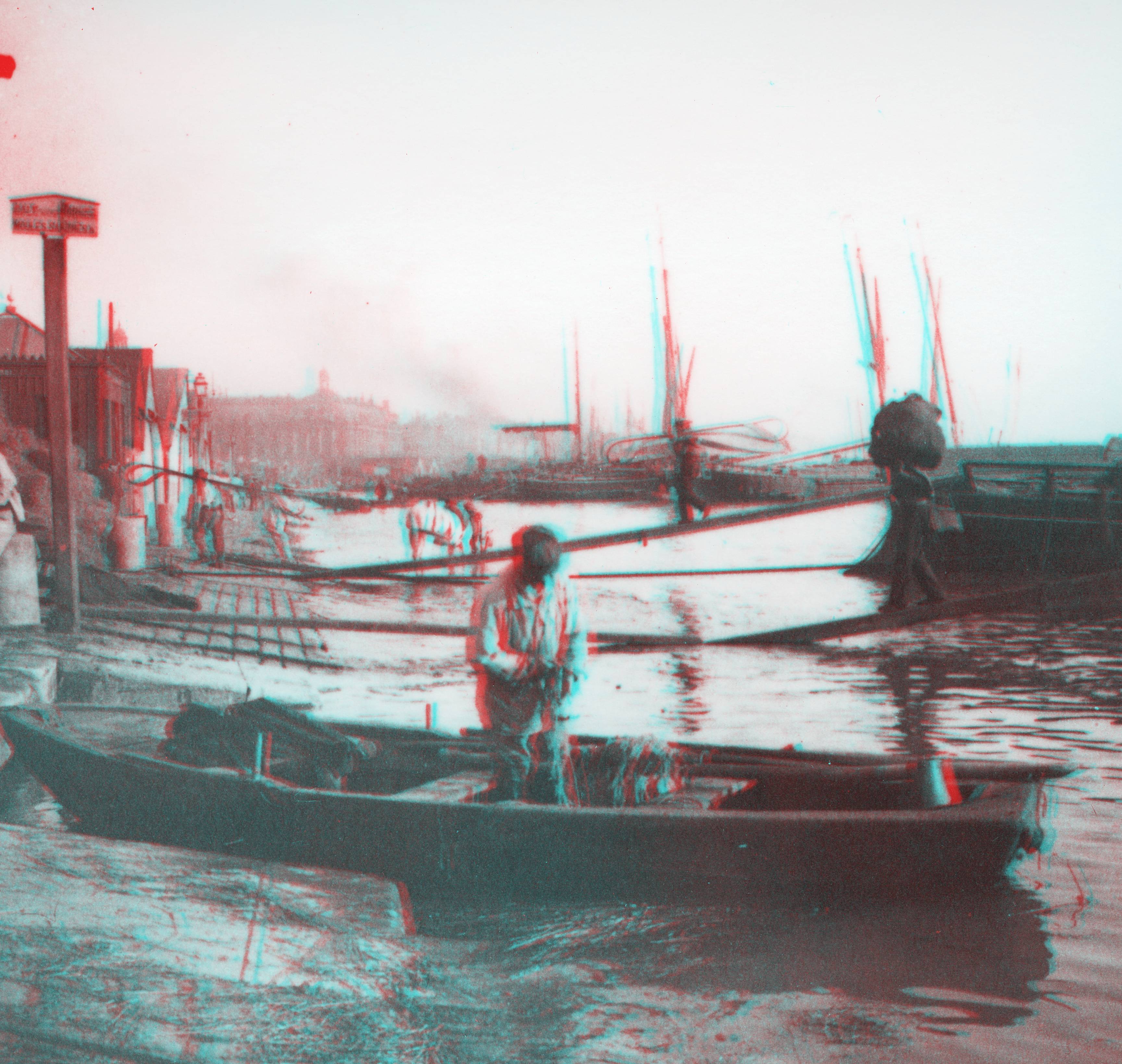 Amusons-nous de ce pêcheur sur sa barque préparant son matériel, indifférent à l’activité environnante, sans doute quai Richelieu, en aval du Pont de Pierre (que l’on ne voit pas sur la photo). Cette partie du port, immédiatement en aval du pont, prolonge le port fluvial de Bordeaux, essentiellement concentré en amont du pont, avec une intense activité de gabarres apportant les marchandises de l’Agenais et du Marmandais. Nous sommes avant 1926, date à laquelle les quais verticaux ont été généralisés. Les berges étant encore en pente, des pontons sont amarrés à une dizaine de mètres du bord, pontons auxquels les navires comme les gabarres sont appontés. Le chargement et le déchargement sont effectués sur des passerelles rudimentaires, comme l’on voit en arrière plan, avec des portefaix descendant les charges en équilibre sur leurs planches. En arrière de ces pontons, on aperçoit la mâture d’un grand trois-mâts.