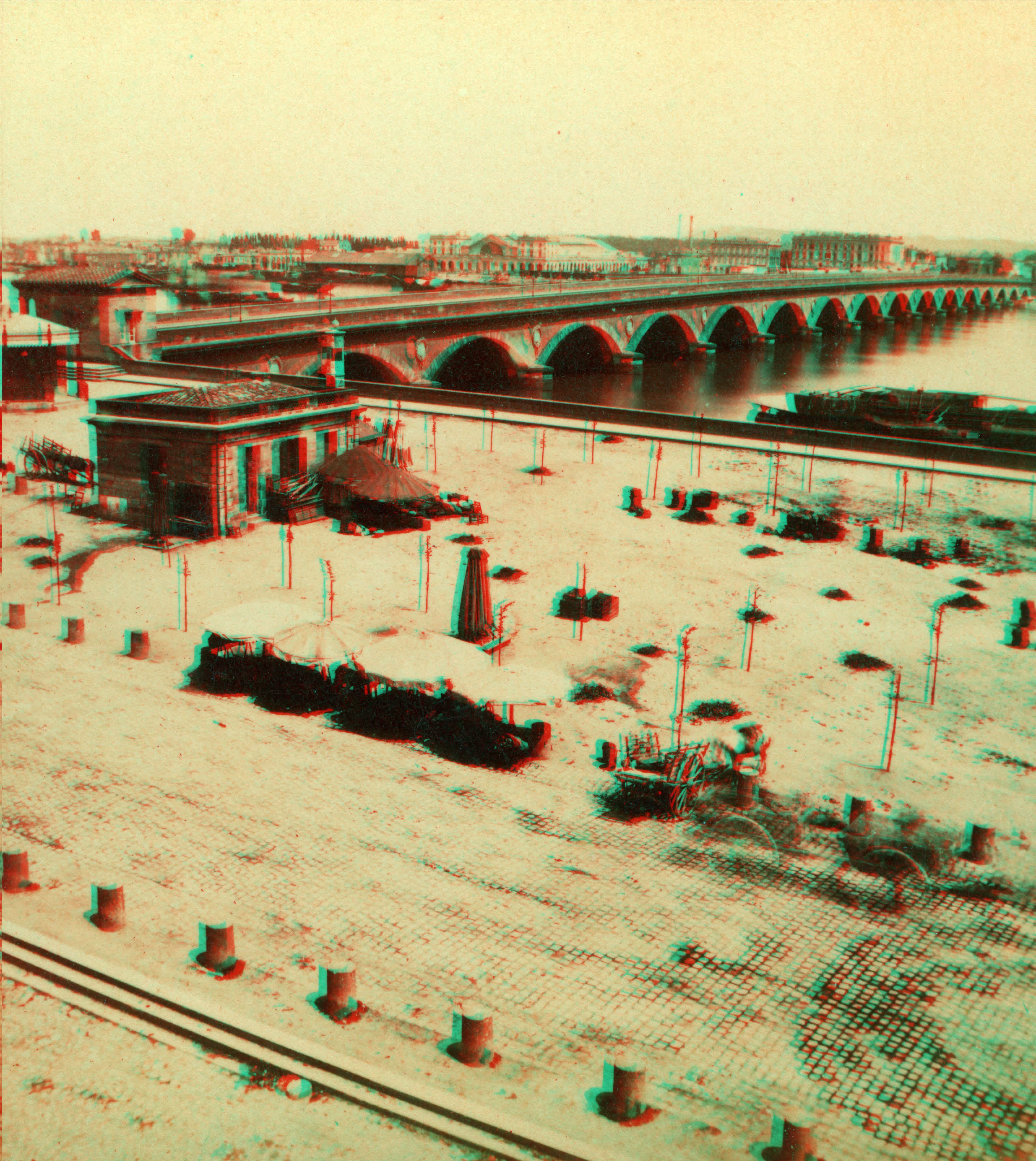 Au centre de la photo, le Pont de Pierre. Au premier plan le quai pavé et remarquablement vide. Des étalages de marchandes des quatre saisons sont protégés par des parasols dont l'ombre portée est quasiment verticale : on peut imaginer le port plongé dans la torpeur d'une chaude journée d'été, à la coupure de mi-journée. A quai, en contrebas du parapet qui descend du pont, des gabarres amarrées en long. A l'entrée du pont, le bâtiment de l'octroi où l'on acquittait un droit pour faire entrer les marchandises en ville jusqu'avant la Seconde Guerre mondiale. Les maisons à octroi ont été démolies peu avant 1954. De l'autre côté du pont, on devine quelques navires à vapeur. Au fond de la photo, on distingue clairement la gare d'Orléans qui fut le terminus des trains de Paris avant la construction de la passerelle de chemin de fer. Le 10 novembre 1862, Jean Andrieu vient déposer plusieurs photographies d'une série non mentionnée clairement mais qui correspond à celle qu'il nommera par la suite Villes et Ports maritimes. A l'occasion de ce dépôt, Jean Andrieu fait enregistrer un lot de 77 photographies de Brest, Bordeaux, Cherbourg et du Havre. Ce tirage porte le numéro 7346 du dépôt légal du département de la Seine.