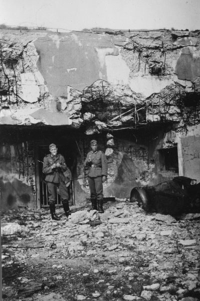 Deux soldats allemands posant devant un blockhaus en juillet 1940 en Moselle sur la ligne Maginot