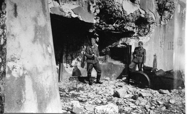 Deux soldats allemands posant devant un blockhaus en juillet 1940 en Moselle sur la ligne Maginot