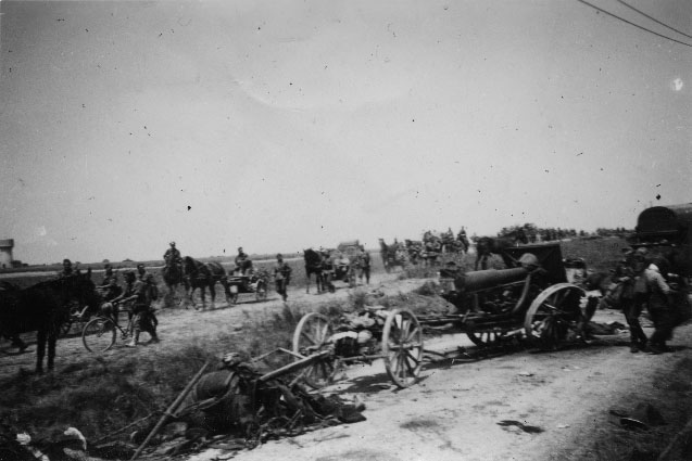 Un convoi allemand contourne des batteries d'artilleries françaises en 1940 en France