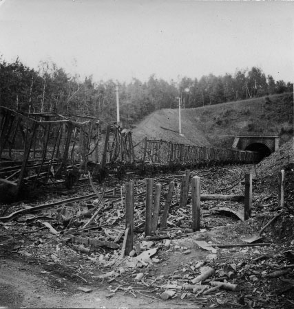 Carcasse de train qui transportait des munitions et qui a explosé. La carcasse est sur les rails, du côté d'Angers.