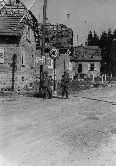 Soldats allemands postés à la frontière franco-allemande près de Bitche en mai 1940 pour empêcher les gens de rentrer chez eux.