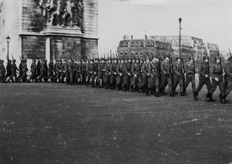 Défilé de l'armée allemande aux Champs Elysées à Paris, aux pieds de l'Arc de Triomphe, le 14 juin 1940, pendant la Seconde Guerre mondiale.