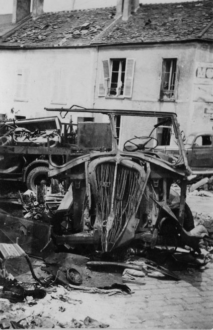 Carcasse de voiture dans la rue principale d'Etampes bombardée par les allemands le 14 juin 1940 pendant la Seconde Guerre Mondiale
