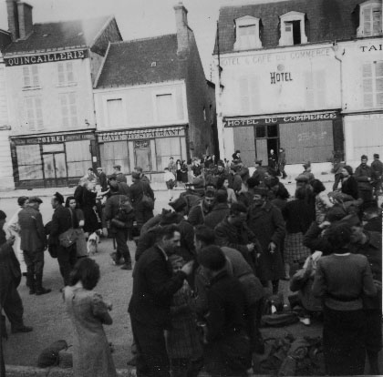 Prisonniers français avec civils (semblant donner un peu de ravitaillement) dans un village en France pendant la seconde guerre mondiale en 1940.