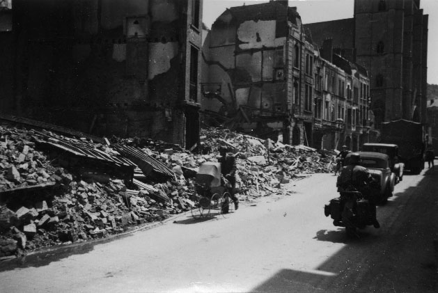 Convoi de voitures et camions allemands traversant une ville détruite en juin 1940 pendant la Seconde Guerre Mondiale dans une ville inconnue en France