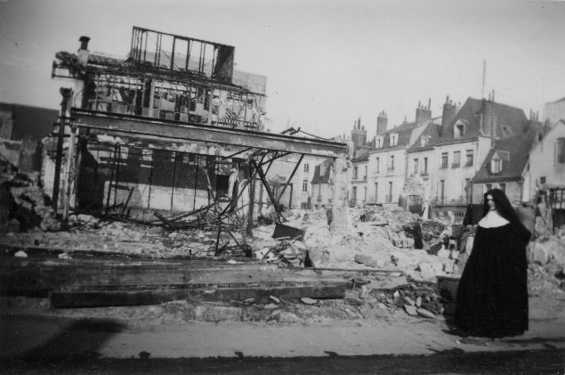 Bonne sœur marchant dans un ville en ruines en France en 1940 lors de l'avancée des Allemands pendant la Seconde Guerre Mondiale.
