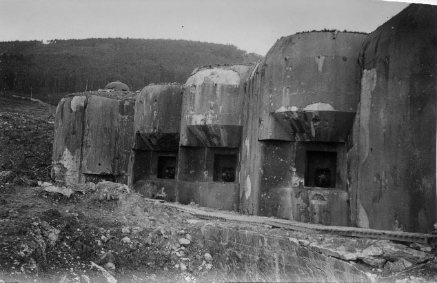 Blockhaus abîmés avec des embouchures de canons. Photo prise en juin/juillet 1940 près d'une forêt en Moselle sur la ligne Maginot.