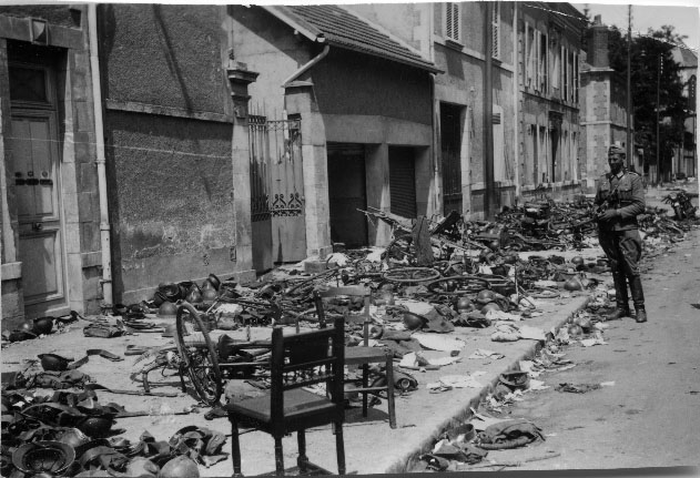 Casques et vélos abandonnés par les prisonniers français en mai 1940 vers Charleville-Mézières dans les Ardennes.