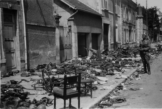 Casques et vélos en abandonnés par les prisonniers français en mai 1940 vers Charleville-Mézières dans les Ardennes