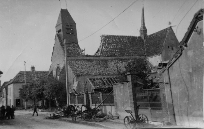 Église détruite dans un village en France lors de l'avancée des allemands pendant la Seconde Guerre mondiale en 1940