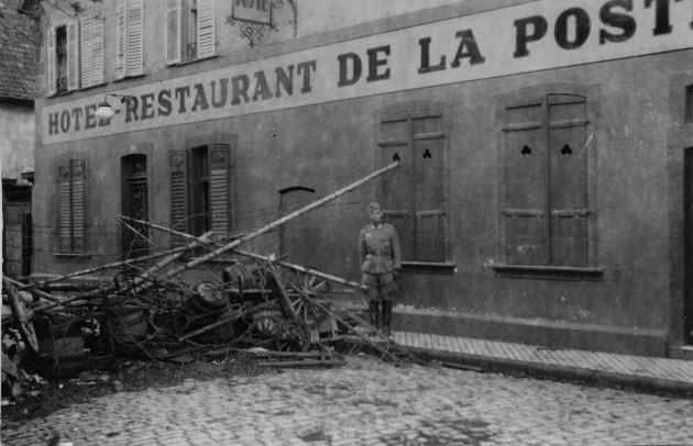 Officier allemand posté devant l'hôtel-restaurant de la Poste, dans une ville inconnue en 1940 pendant la Seconde Guerre mondiale en France.