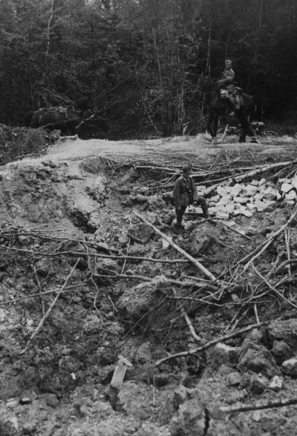 Deux soldats allemands près des restes d'un pont détruit en 1940 en France