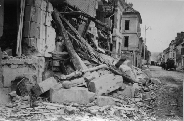 Débris de destruction dans un village en France en mai-juin 1940, pendant la Seconde Guerre mondiale.