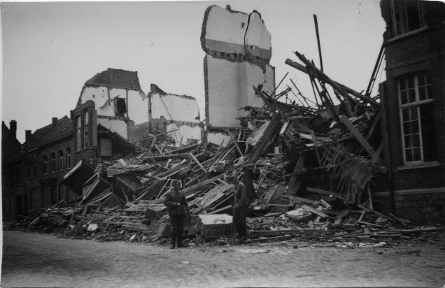 Soldats allemands devant une maison en ruines pendant l'avancée allemande en juin 1940