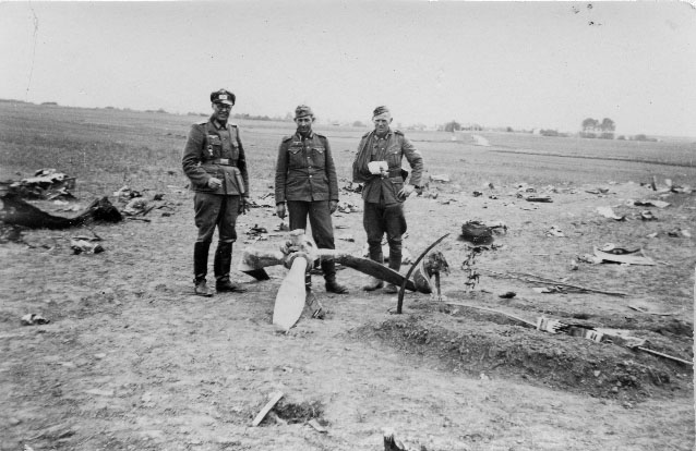 Soldats allemands devant l'hélice d'un avion abattu et le casque de l'aviateur en 1940 en France.