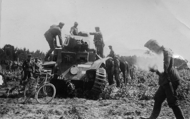 Char allemand Panzer détruit en juin 1940 dans des champs du nord de la France lors de la Seconde Guerre mondiale. Des soldats allemands montent dessus et l'observent de près.