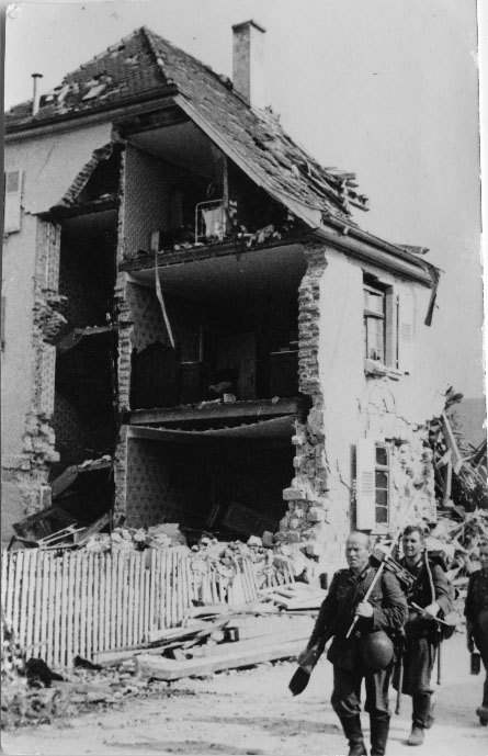 Des soldats allemands en marche dans un village en ruines en juin 1940 en France