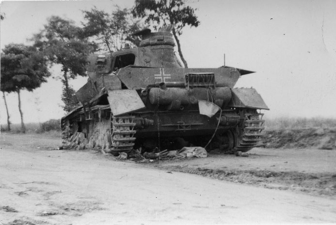 Char allemand Panzer détruit quelque part en France en mai 1940