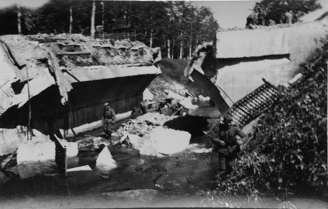 Un pont dynamité par l'armée française pour empêcher la progression de l'armée allemande en mai 1940 en France