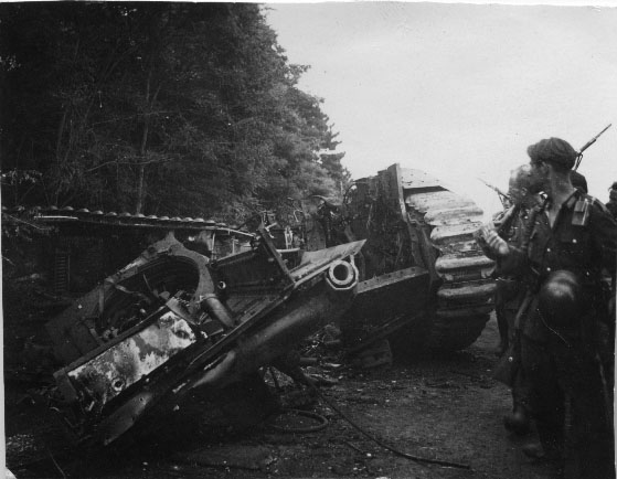 Char français Renault B1 bis détruit entouré de soldats allemands en France en juin 1940
