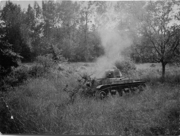 Char français Renault R 35 commençant à brûler dans les bois de la campagne française en mai 1940.