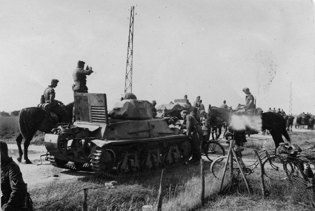 Des soldats allemands entourent un char français abandonné en bord de routes de France en mai 1940. L'un des soldats, debout sur le char, prend en photo ses camarades qui regardent l'arrière du char. On voit tous les soldats allemands avançant.