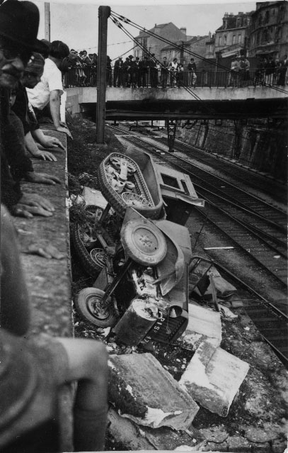 Civils observant une Citroën Kégresse tombée sur les voies en mai 1940 en France