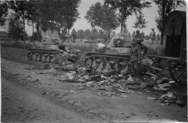 Chars français Renault R 35 abandonnés sur les routes de France en 1940 pendant la Seconde Guerre mondiale. Des affaires gisent par terre, provenant de la cariole de ravitaillement. Deux soldats allemands posent devant les décombres.