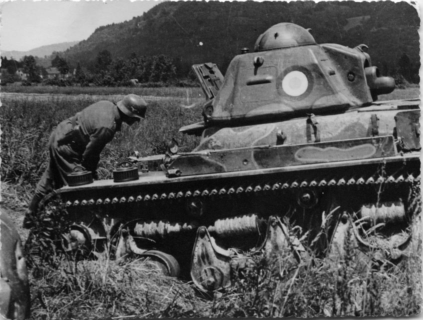 Soldat allemand observant un char français Renault R 35 abandonné dans la campagne française en mai 1940