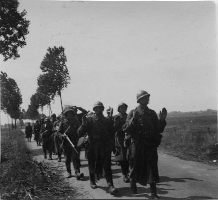 Soldats français prisonniers marchant sur une route de campagne française vers un camp de prisonniers en Allemagne en 1940