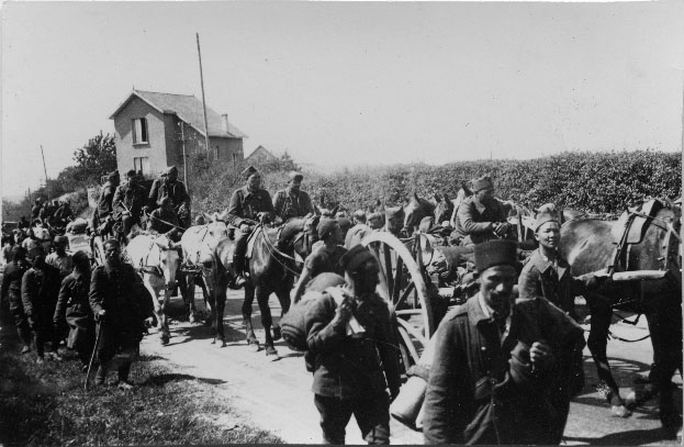 Prisonniers nord-africains marchant en convoi, à pied et en charrette, vers l'Allemagne pour rejoindre les camps de prisonniers en 1940 pendant la Seconde Guerre mondiale.