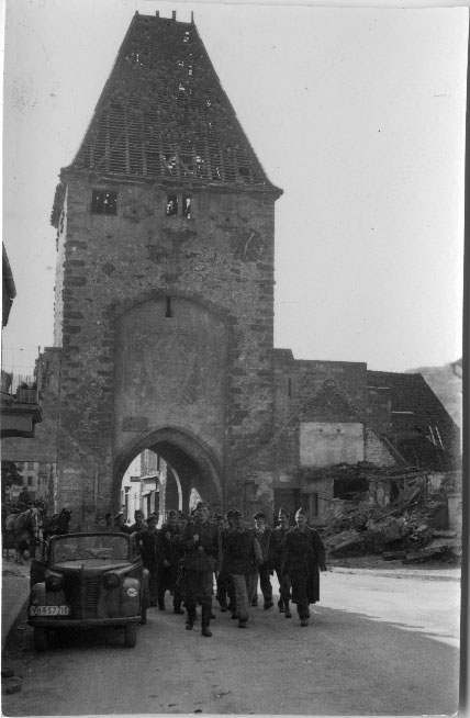 Soldats allemands passant la porte de Montbazon sur la route de Paris en 1940 pendant la Seconde Guerre mondiale.