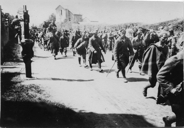 Soldats français en marche en France pour rejoindre les camps de prisonniers en Allemagne en mai/juin 1940