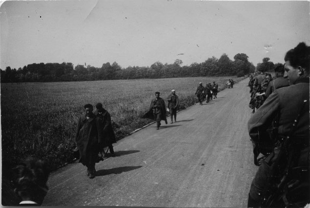 Croisement de deux troupes allemande et française en mai/juin 1940 en France. Les allemands à cheval à droite envahissent la France et les prisonniers nord africains à gauche se dirigent vers l'Allemagne.