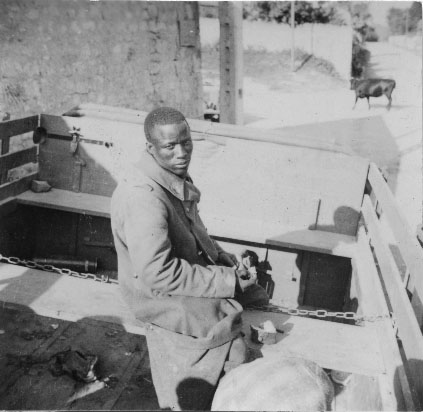 Un tirailleur sénégalais prisonnier, assis à l'arrière d'un camion en route pour les camps de prisonniers allemands, en France en 1940 pendant la Seconde Guerre mondiale.