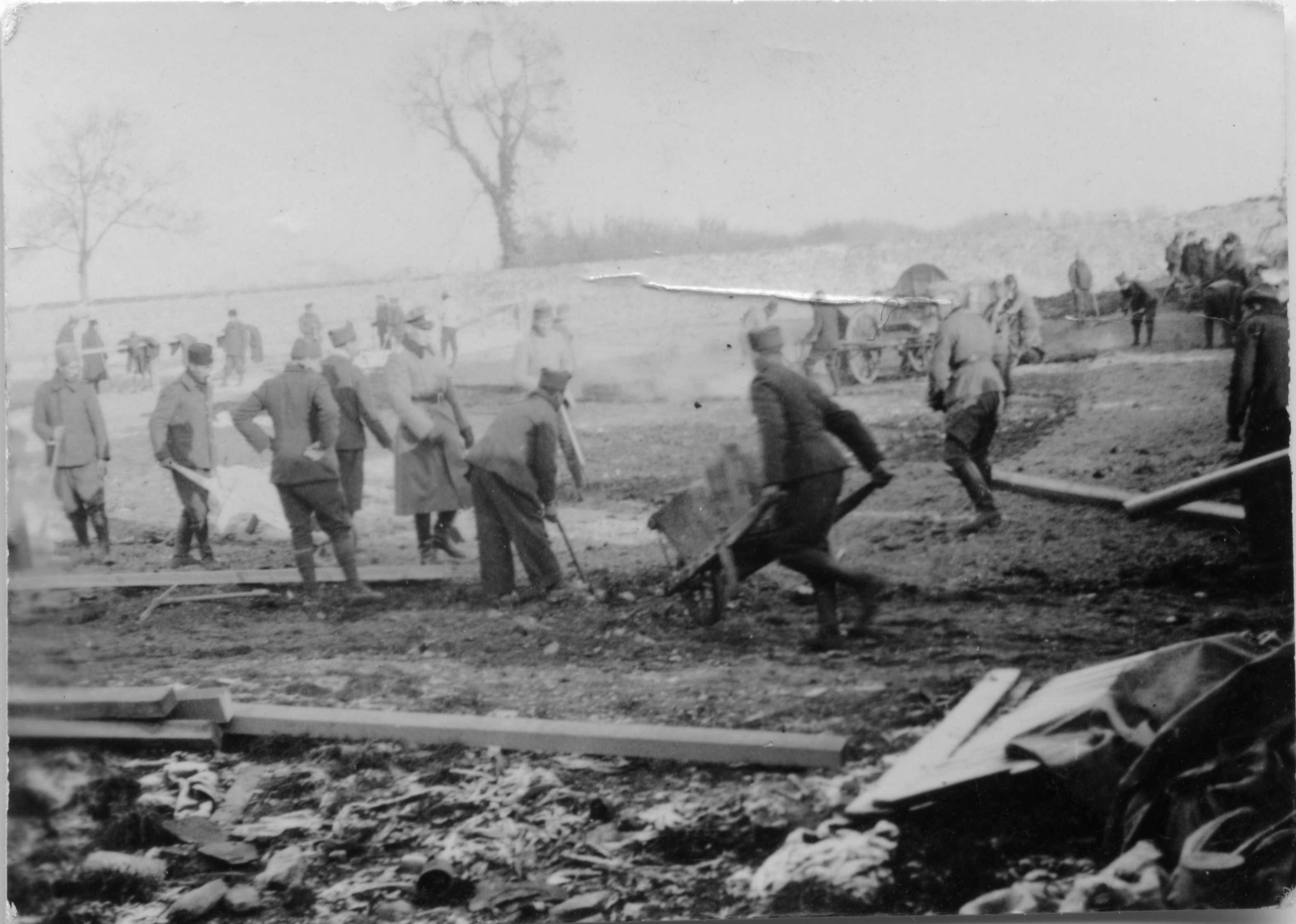 Prisonniers nord africains construisant des baraques dans un camp de travail en France en 1940