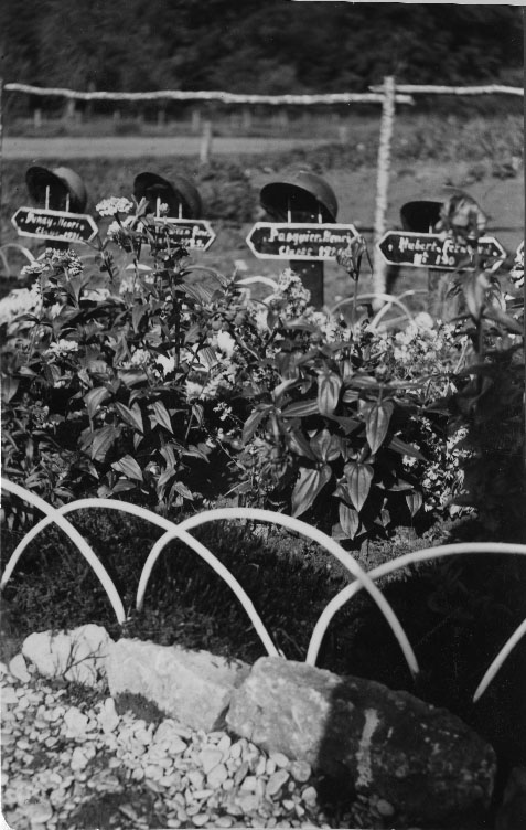 Rangée de tombes improvisées de soldats français, avec casques et fusils plantés, quelque part dans la campagne française en 1941. Le tout est clôturé comme un petit jardin.