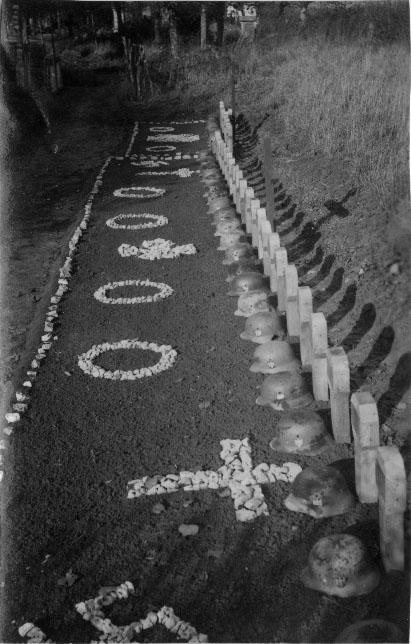 Rangée de plusieurs tombes de soldats allemands (avec casques) en bord de route quelque part en France en mai 1940 pendant la Seconde Guerre mondiale. Des pierres blanches posées décorent les tombes.
