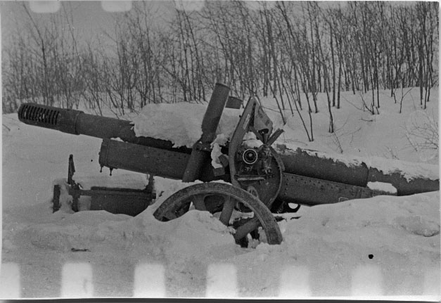 Canon russe abandonné et enneigé entre 1941 et 1944 pendant la Seconde Guerre mondiale.