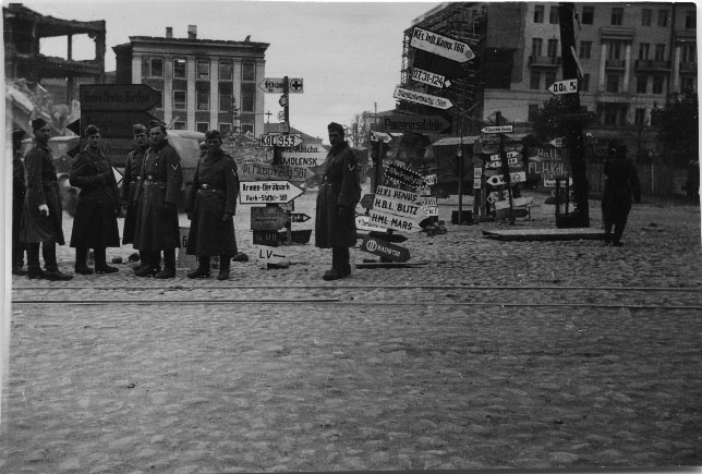 Soldats allemands en Russie entre 1941 et 1942 devant des panneaux indiquant diverses destinations et services
