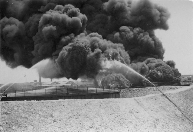 Des réserves de fioul bombardées le 29 août 1944 à La Pallice à La Rochelle. Des jets d'eau tentent en d'éteindre l'incendie.